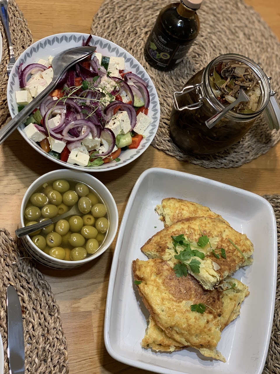Espanjalainen munakas taipuu päivän monelle aterialle. Meillä nautiskeltiin lauantaina illallisella tapaspöydän lämpimäisenä. Kuvittelin, että näin syödään kevyesti vaan ei kovin kevyt olo ollutkaan. Melko tuhti pala tuo onkin perunoineen ja kananmunineen. Hyvin sai hyödynnettyä valmiiksi keitetyt perunat ja valmistui lähes kuin itsestään pannulla...