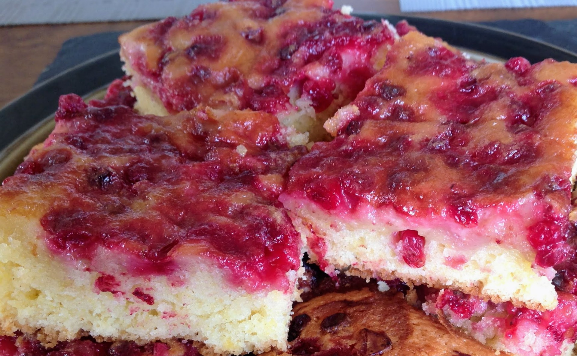 5. Ripottele puolukat taikinan päälle. Levitä kookoskermaseos puolukoiden päälle.