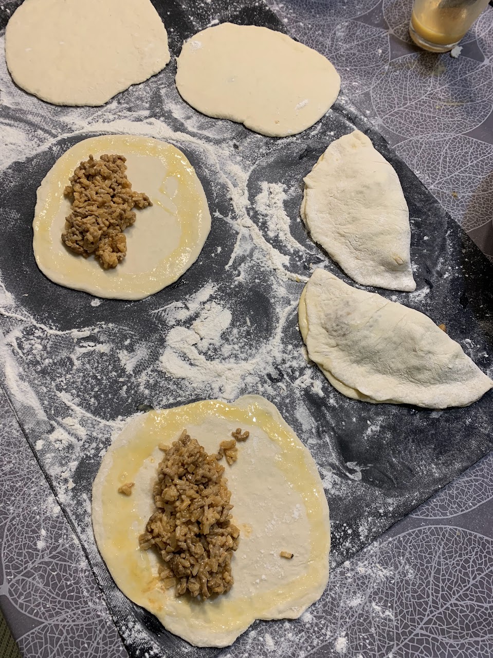 7. Vaivaa kohonnut taikina jauhotetulla leivinpöydällä. Jaa taikina 18 palaan. Kauli aina 6 palaa kerrallaan halkaisijaltaan noin 12 cm:n kokoisiksi pyörylöiksi. Nosta jokaisen pyörylän toiselle puoliskolle 2 rkl täytettä, sipaise taikinalevyn reunat munalla ja käännä päälle toinen taikinapuolisko. Nipistä reunat hyvin kiinni.