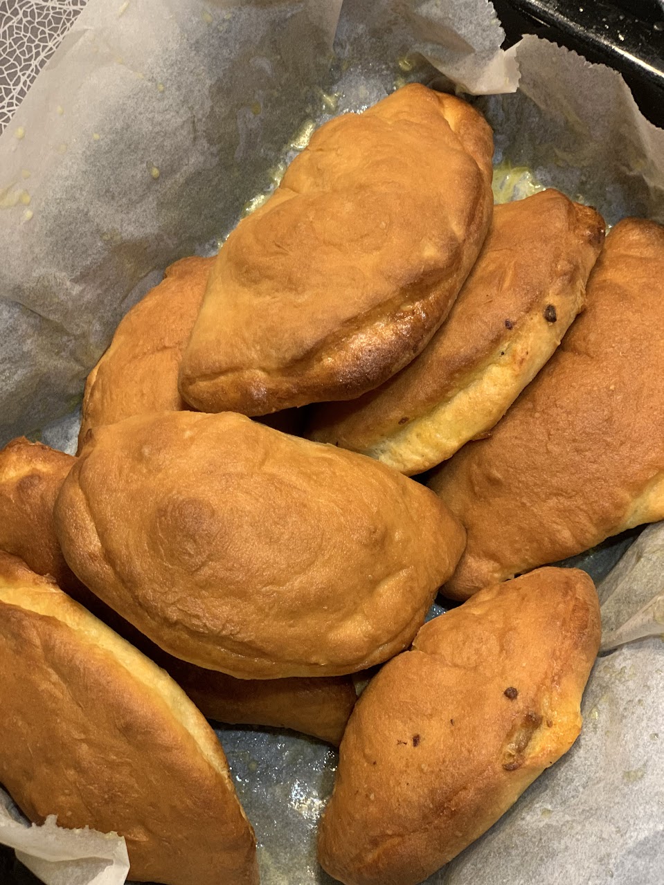 8. Paista 200-asteisen uunin keskitasolla. Paistoaika on noin 25 minuuttia. Voitele kypsät lihapiirakat kuumina voisulalla ja anna niiden pehmetä leivinpaperin ja pyyheliinan sisällä.