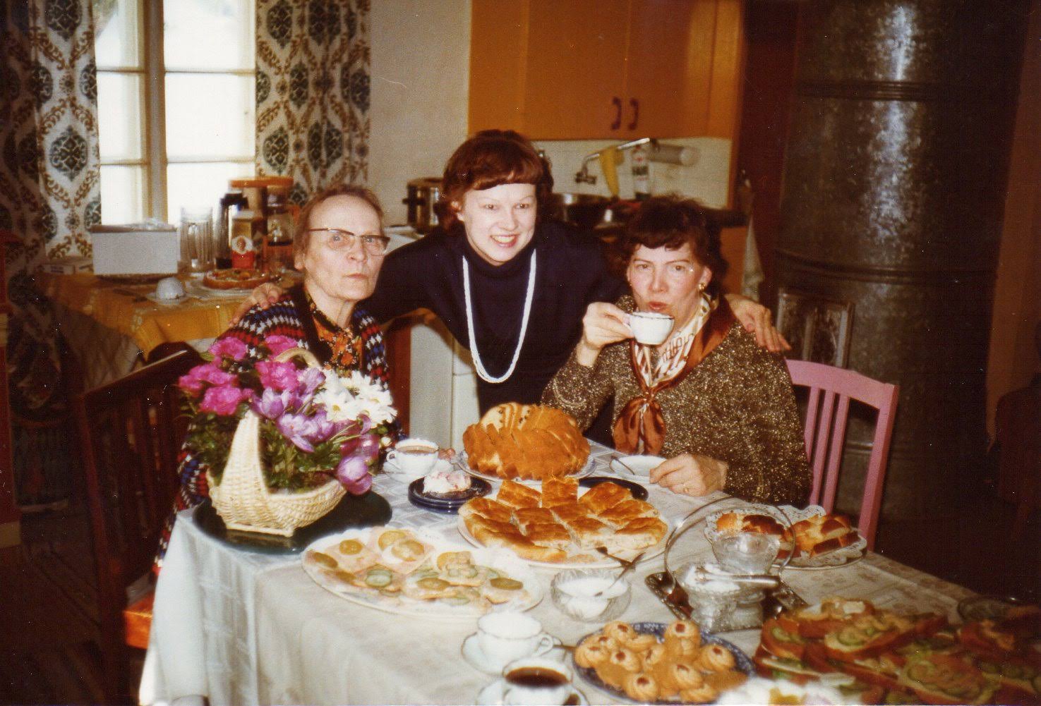 Kuvassa alla molemmat isoäitini sekä äitini ja kahvipöytää voileipätarjoiluineen 1970-1980 luvun taitteen malliin.